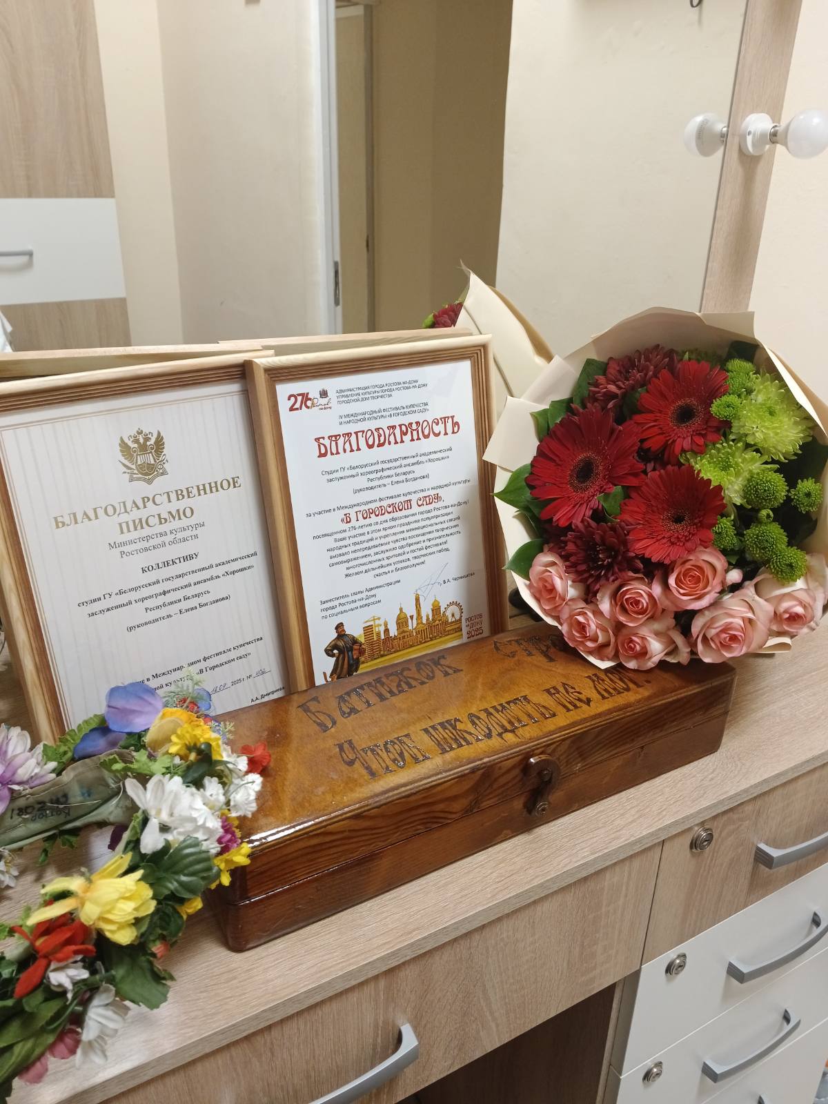 Это был по-настоящему яркий праздник популяризации народных традиций и укрепления межкультурных связей. Детская студия ансамбля «Хорошки» представила самобытную и живую белорусскую хореографию, заслужив признательность зрителей и бурные аплодисменты. Из Ростова-на-Дону привезены благодарности Министерства культуры Ростовской области, Управления культуры г. Ростова-на-Дону, Городского дома творчества. Руководитель группы и детской студии - Богданова Елена Николаевна.