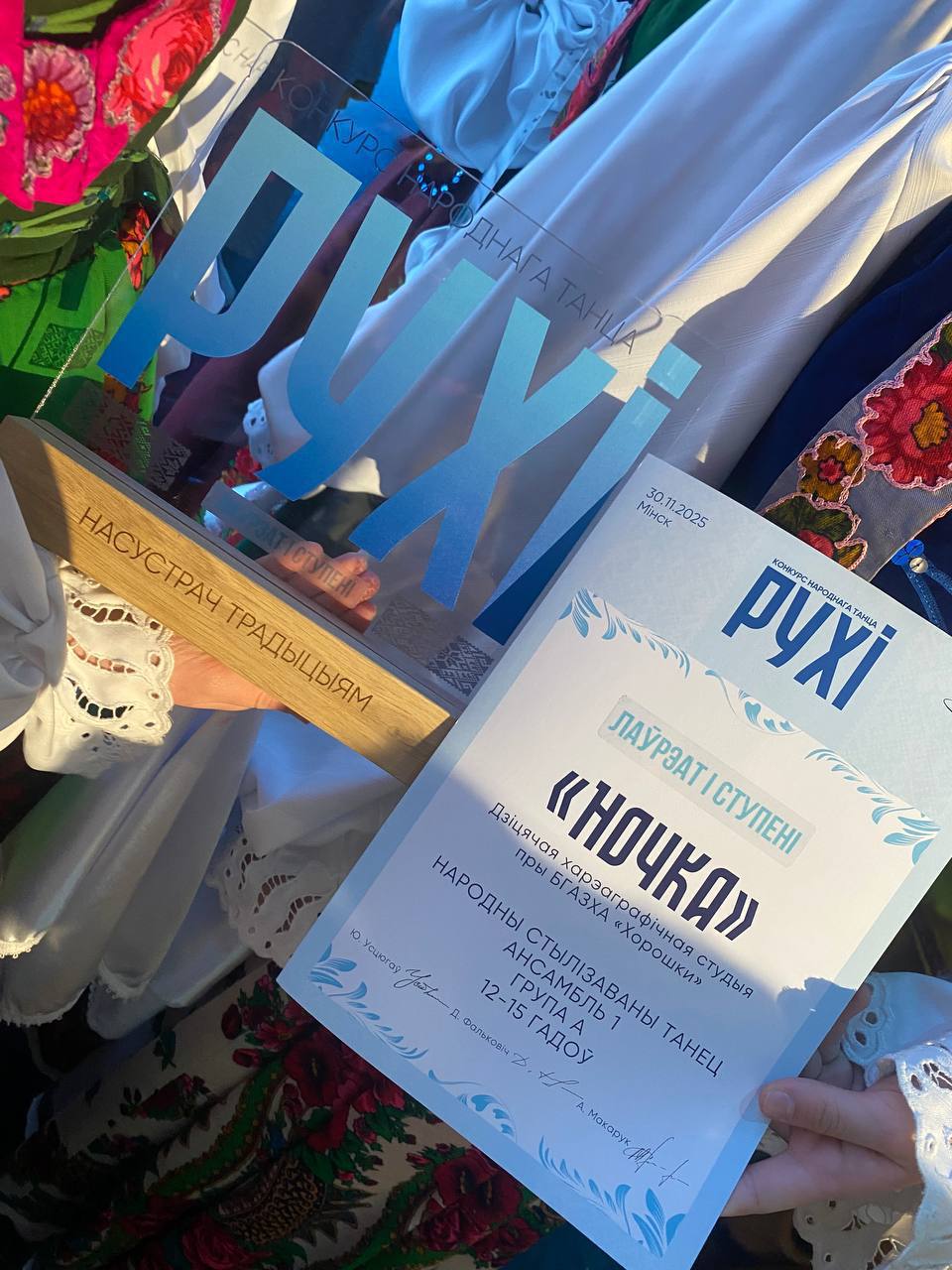 Девушки завоевали диплом Лауреата I степени на конкурсе народного танца «РУХІ» (г. Минск) за номер «Ночка» в возрастной категории 12-15 лет в номинации «Народный стилизованный танец».